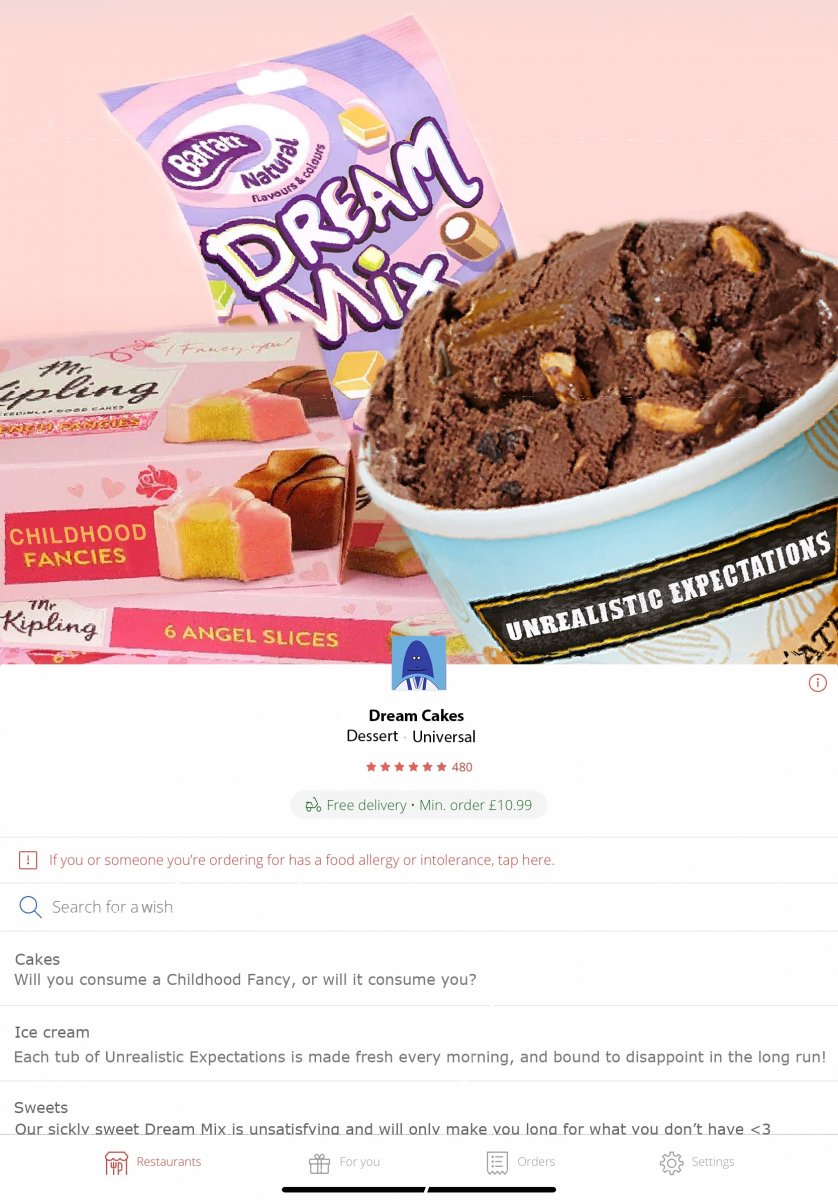 Dream Cakes is an imaginary takeaway restaurant serving the sickly sweet aspirations you had as a child. But is it actually healthy to dwell on our unfulfilled fantasies? As adults we can become consumed with regret when looking back on what we gave up on, forgetting that the people we are now are so much more than we were ever able to dream of becoming.